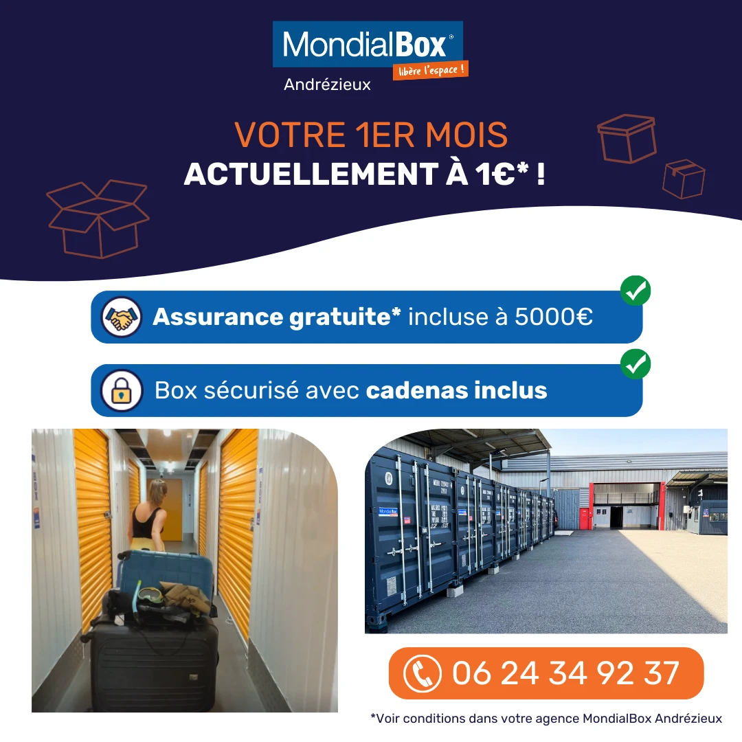 Besoin de place ? Chez MondialBox Andrézieux, votre 1er mois de box de stockage est à 1€ ! Assurance incluse jusqu’à 5000€ et cadenas fourni. Contactez-nous au 06 24 34 92 37. *Voir conditions en agence.